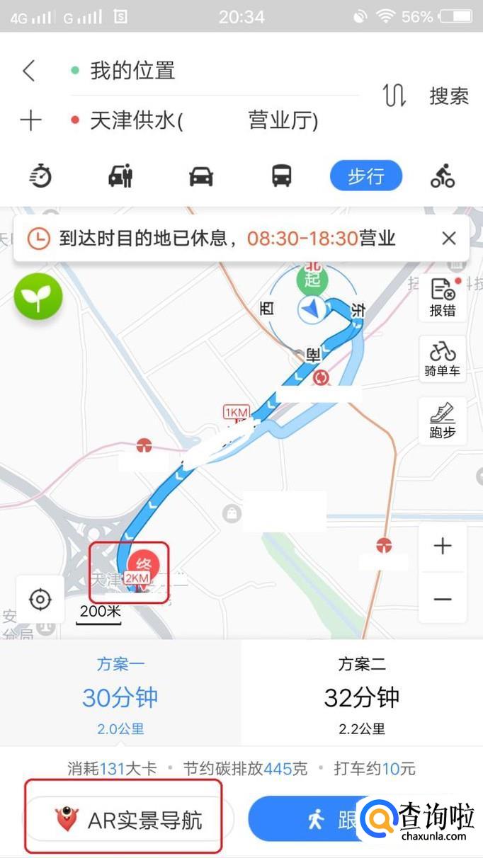 这样,地图上就会显示我们的步行路线,我们看到左下角有一个“AR实景导航”按钮,我们点击一下就可以了。