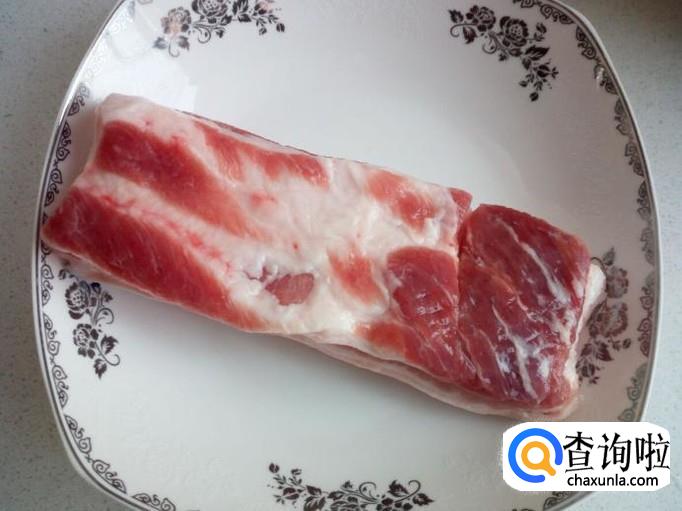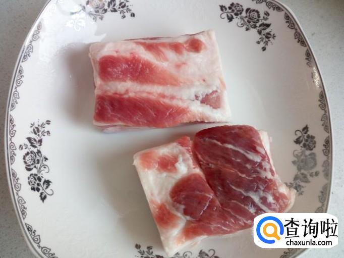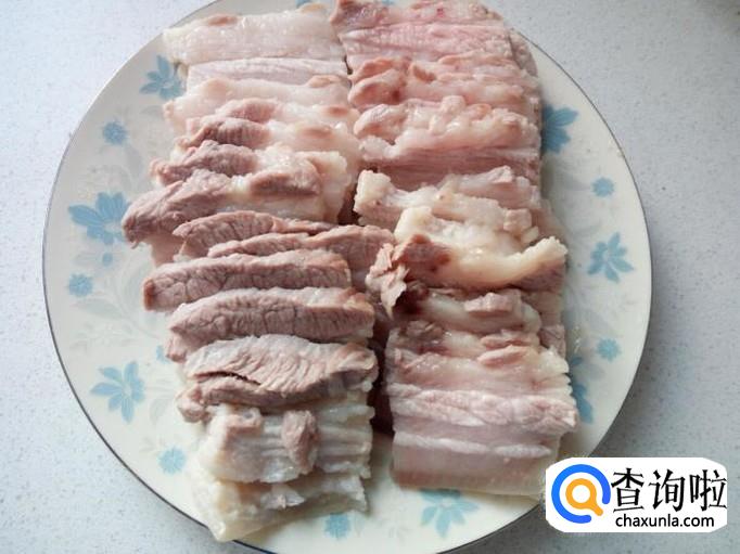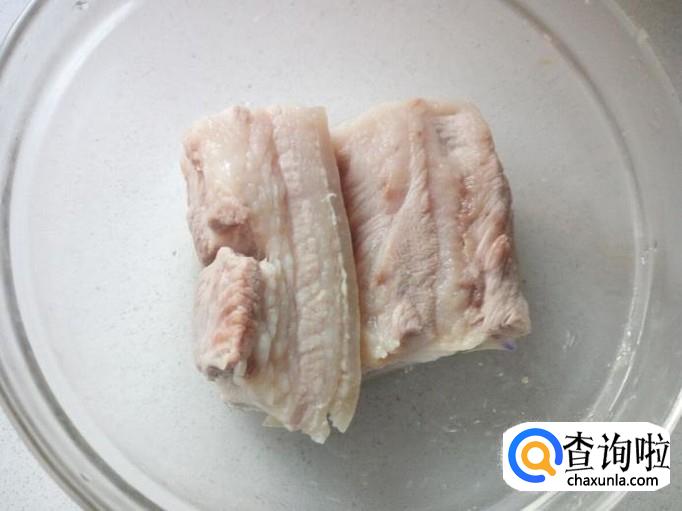 五花肉用水冲洗干净,控干水分,对半切成块。