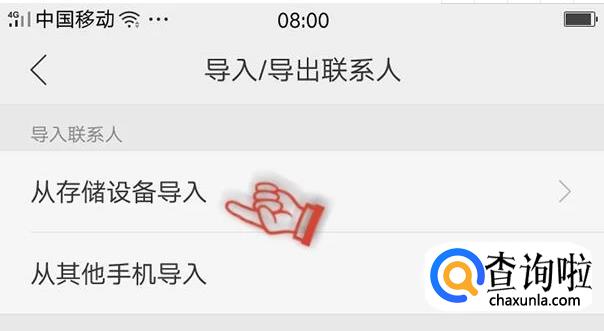 打开【导入/导出联系人】后,我们选择合适的导入导出方式。我们选择【从存储设备导入】。