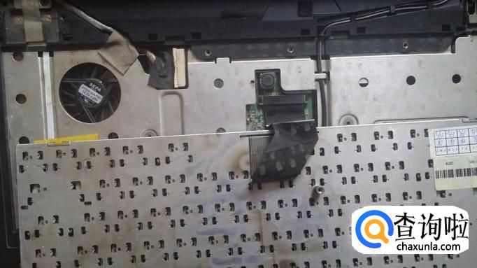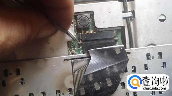 拆下按键板,被压在下面的键盘就全露出来了。但还不能一下把键盘拿下来,小心地把键盘翻过来,可以看到下面有一根排线连接到主板上。