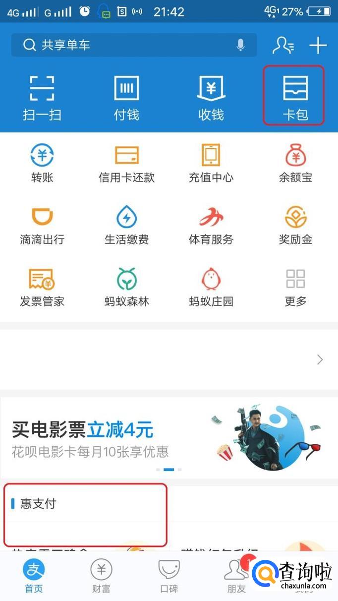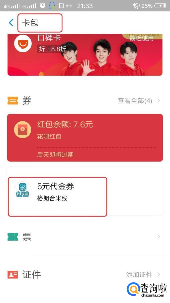 此时,我们回到支付宝首页(步骤1图中),点击右上角“卡包”,就能看到该代金券了,我们点击一下该代金券。