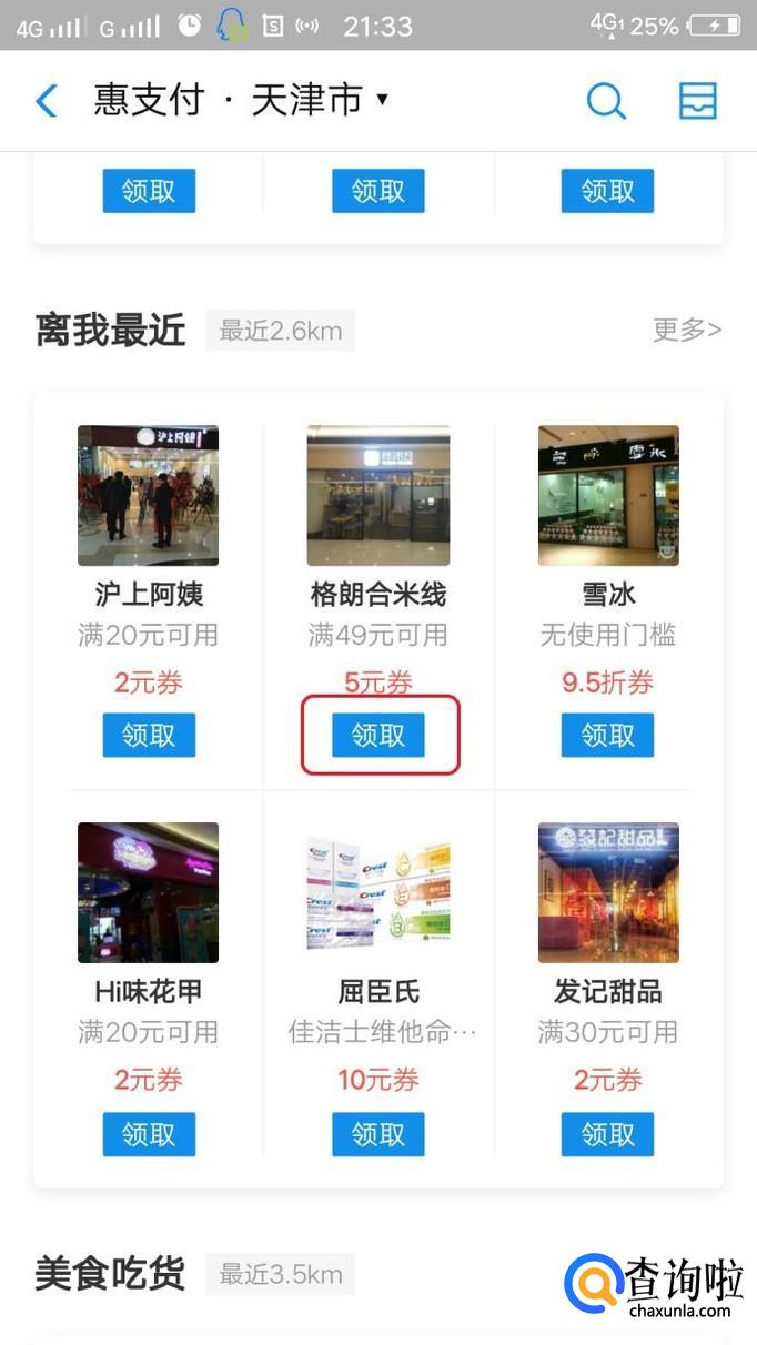 如图所示,支付宝可以领取的代金券是五花八门,餐饮、甜品、超市购物等都有,我领取一个米线代金券来演示吧,如图所示,点击“领取”。
