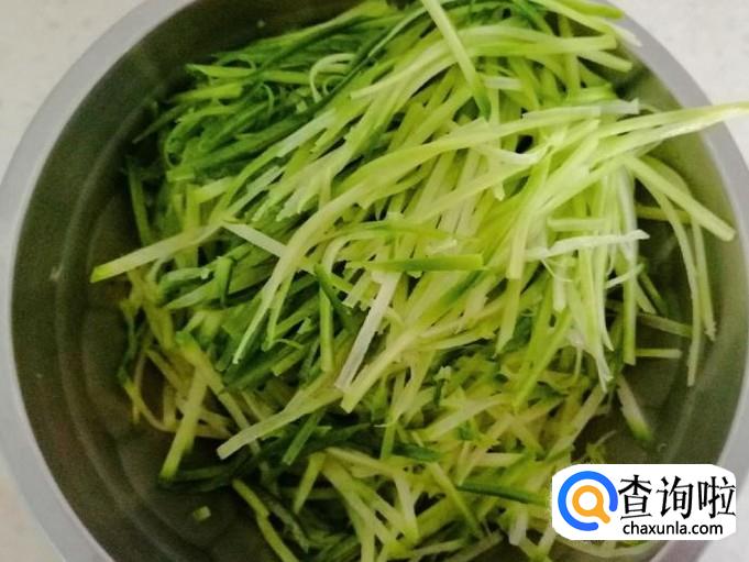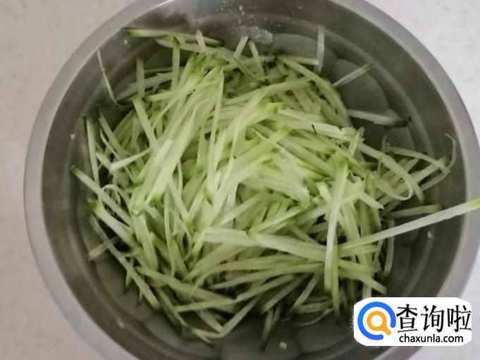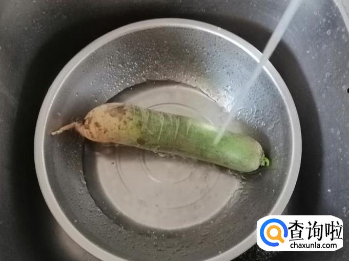 这一步要清洗和处理所用的萝卜。选一个萝卜洗净去掉不容易洗掉的部分皮,萝卜完全可以带皮吃,只要外表光滑洗净就可以,去掉萝卜两头,如图把青萝卜擦成丝待用。