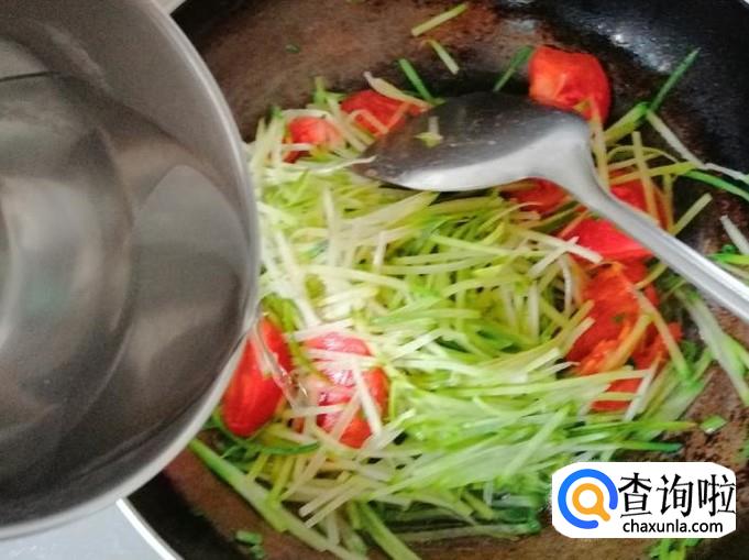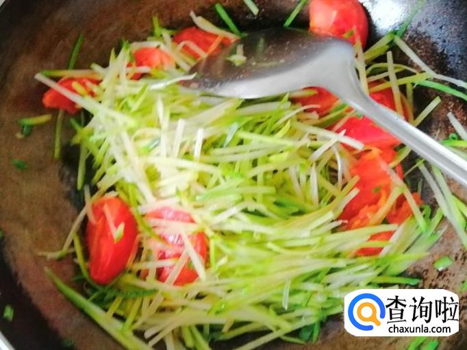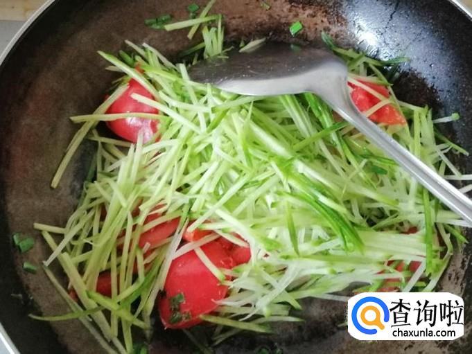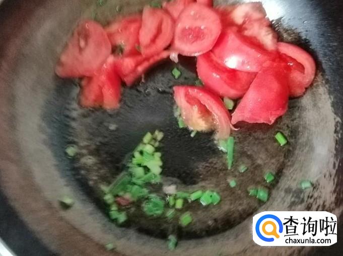 开火准备炝锅,炒锅放油,油热后放入葱花翻炒,然后放入西红柿,翻炒片刻就可以加入备好的萝卜丝,都翻炒均匀。