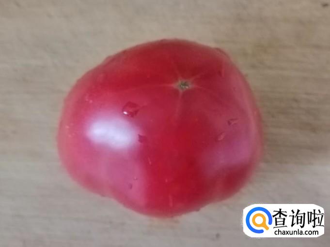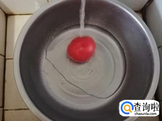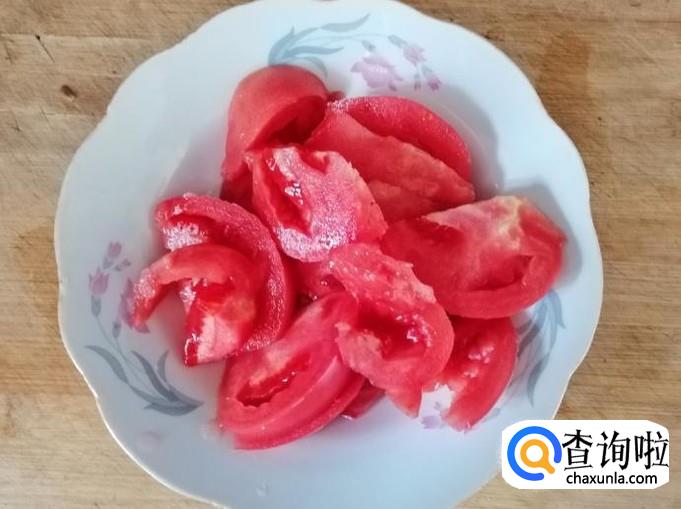 取新鲜的西红柿一个,用水洗净放在菜板上把西红柿切成块,装入盘中待用。为了方便食用,这一步也可以用开水烫一下西红柿,去皮切好待用。