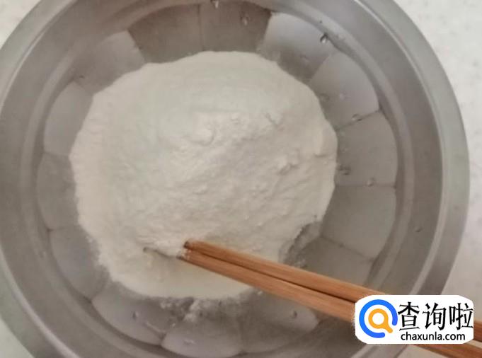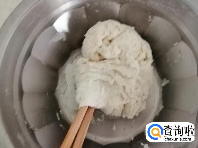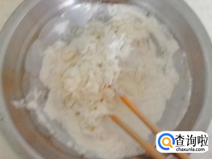 取适量干面粉,这个面粉的用量根据吃饭人数来定,吃完人多就多放些,新手多做几次就会掌握用量,加少量水搅拌如图所示,到最后把干面粉都调成团状就好。