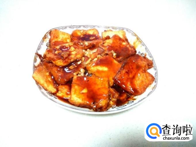 晃动锅,使豆腐都粘上料汁,入味。然后把勾兑好的薄欠倒入锅中,芡汁粘稠后,关火出勺。