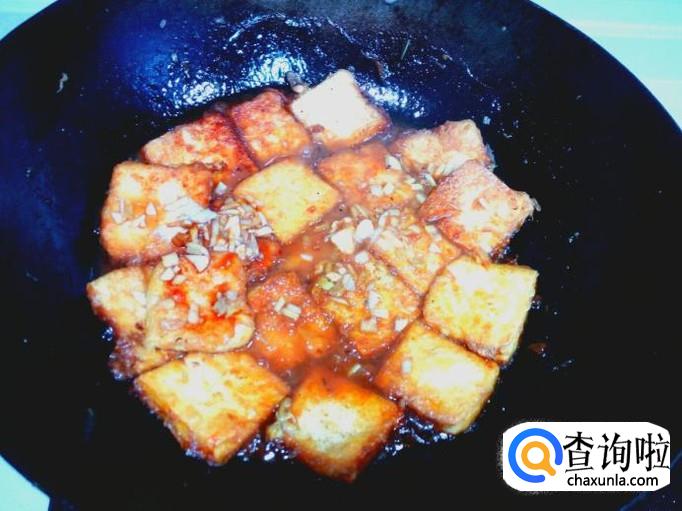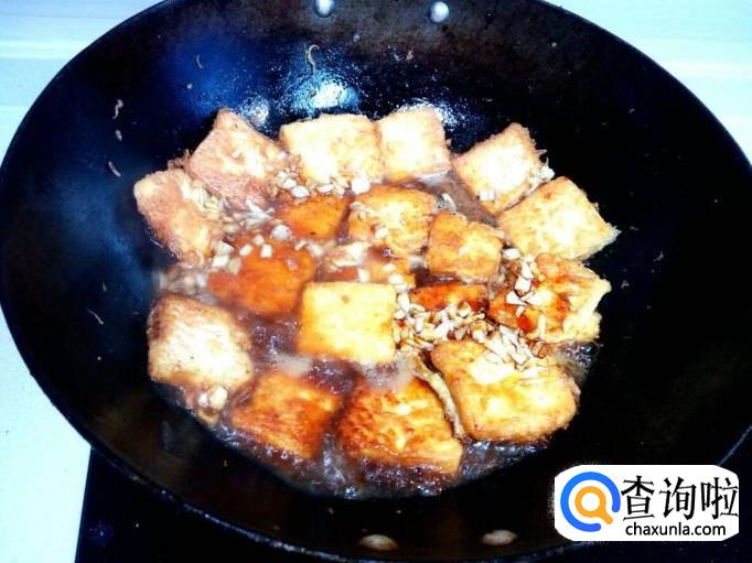 翻面煎塌至豆腐外表焦黄,然后把调和好的料汁倒入锅中烧开(如果锅里油多,倒出一部分)。