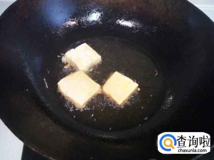 锅内放入油加热,油热后,把豆腐块裹一下淀粉,再裹一下鸡蛋液,然后依次放入锅里,小火煎塌。