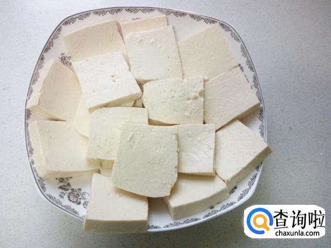 豆腐切成0.5公分左右厚,0.3公分左右见方的块(新买回来的豆腐要控水,避免切的时候破碎)。