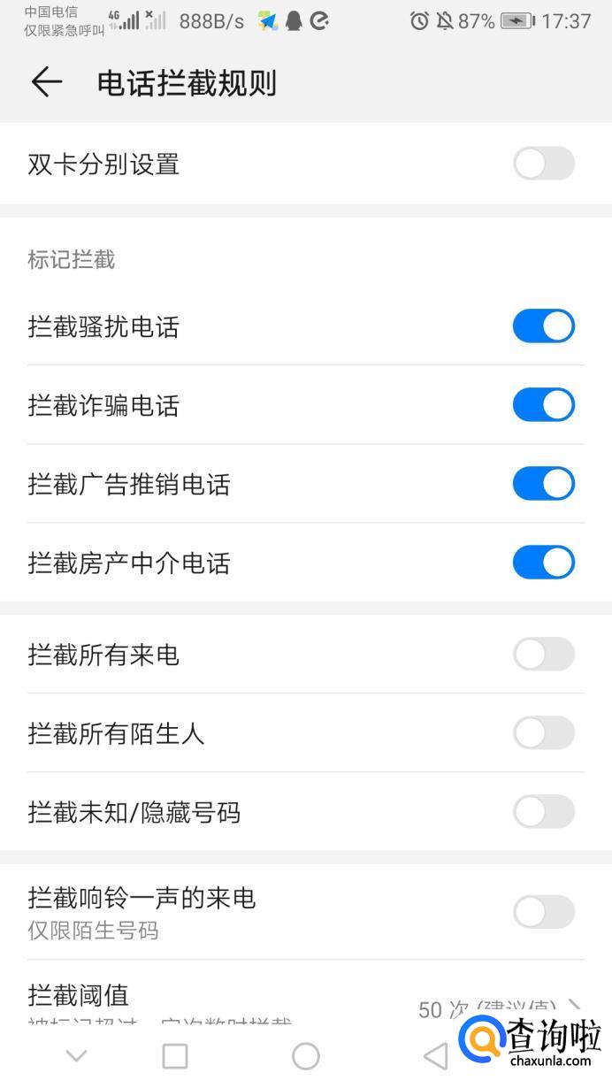 如果想对特定的电话号码设置成停机,就把这个电话号码加入黑名单即可,开启标记拦截,则对于所有的陌生骚扰电话,手机都是停机状态。