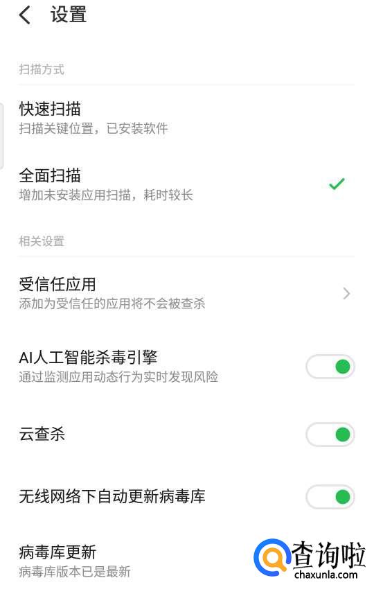 在这里可以手动更新病毒库,但是如果你开启了wifi状态下自动更新,那就不需要再手动更新了,如果你生活场景附近没有wifi那就需要自己隔一段时间点一次咯。