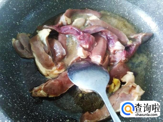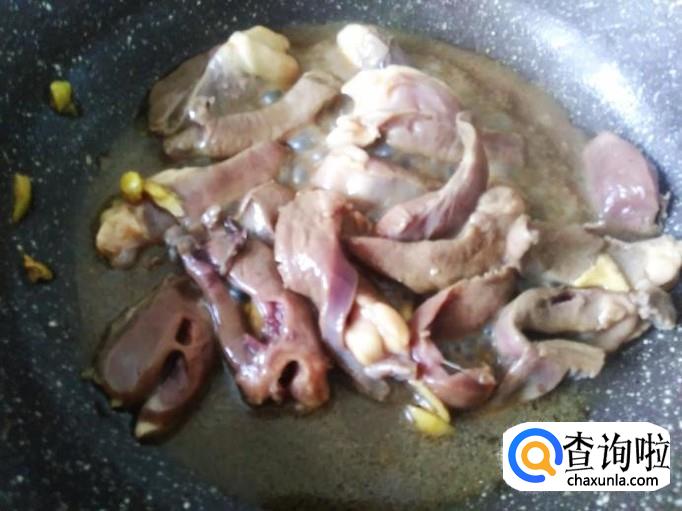 再开火下油,猪心下锅,大火翻炒至变色。