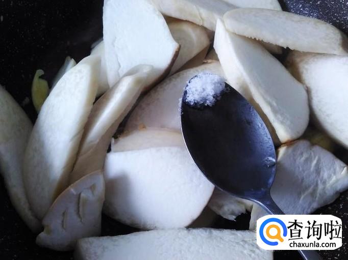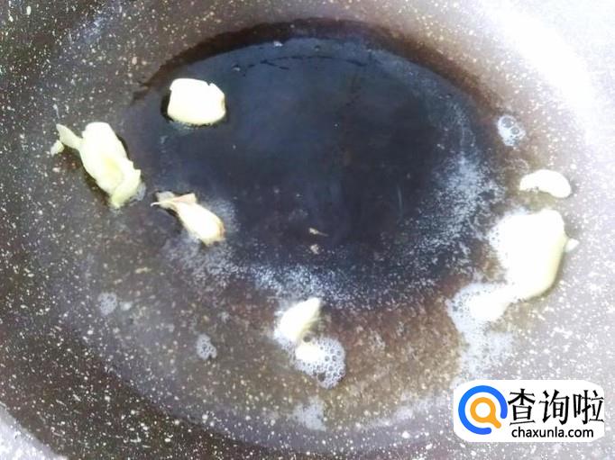 开火下油,放蒜米进去爆出味来,然后放杏鲍菇进去加适量的盐。