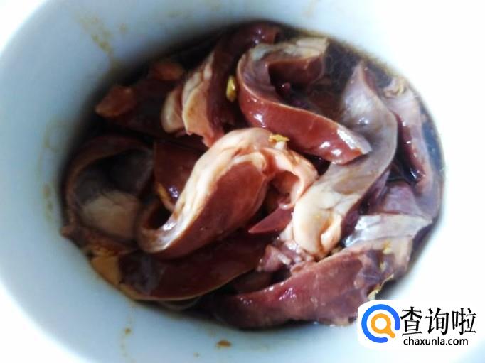 猪心切成薄片,加适量的盐、姜蓉、生抽、料酒腌制十几分钟。