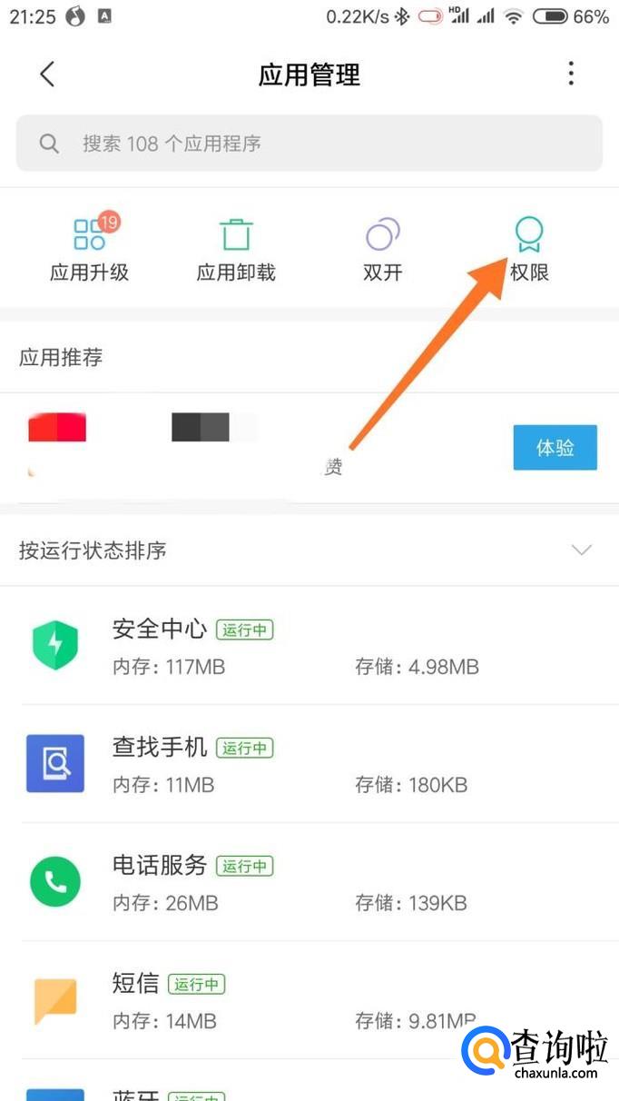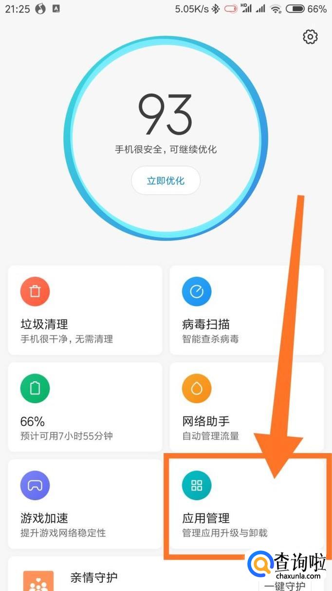 在安全中心里面找到‘应用管理‘,旧版本的MIUI的图标可能不一样,但是名称是一样的。