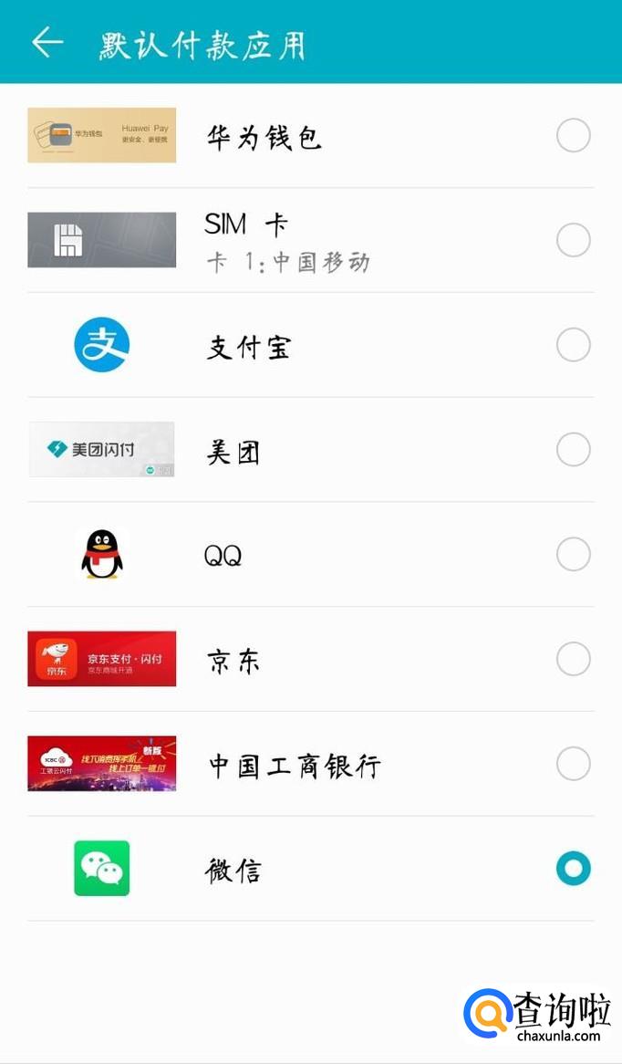 然后可以看到默认付款应用的设置从支付宝改成微信了