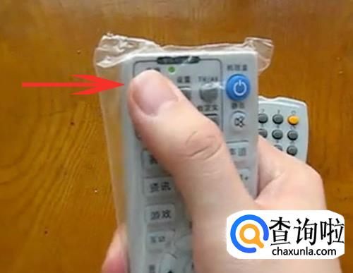 使用电视机遥控器,长按“开关机键”,大概两三秒钟。