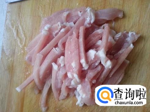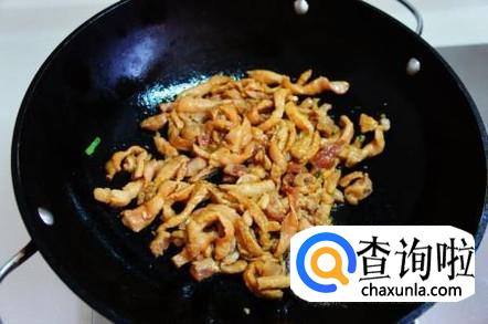 炒锅里放入花生油,等油五成熟时,把猪肉丝入锅,炒至变色,再加入葱,姜,盐,味极鲜酱油调味。。