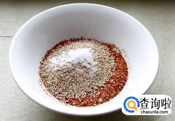 我们先把辣椒粉和白芝麻放到一个容器里面,搅拌在一起,放一些盐,省得没味道,尽可能搅拌均匀,这样子有益于受热均匀,以免一些芝麻被炸糊。