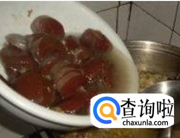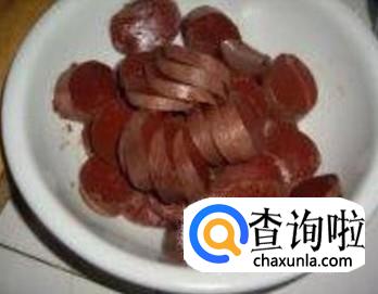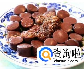 将做好的酱料倒一点在血肠上,和着血肠吃。