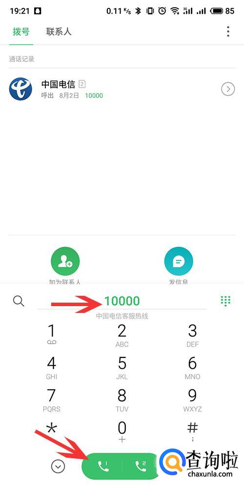 在搜狗百科中可以查询到中国电信的客服热线为10000,打开手机进入拨号界面,输入10000,选择电信号卡拨打。