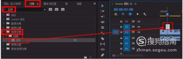 在“效果”面板搜索栏输入“位移”,将其拖到调整图层上。