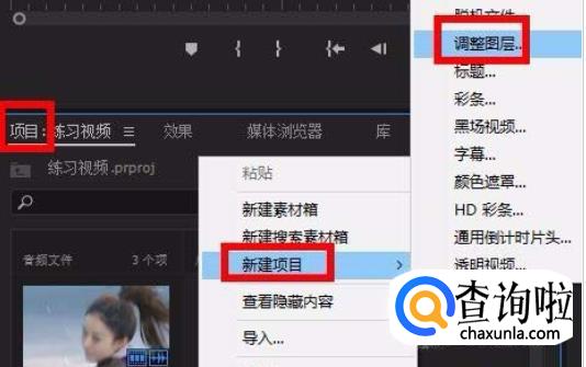 在“项目面板”空白处右击鼠标,选择“新建项目”,然后在右上角点击“调整图层”。