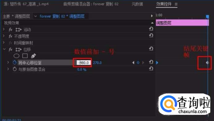 将时间标尺移到调整图层结尾处,修改数值为负原值(即在原数值前加一个减号),建立结尾关键帧。