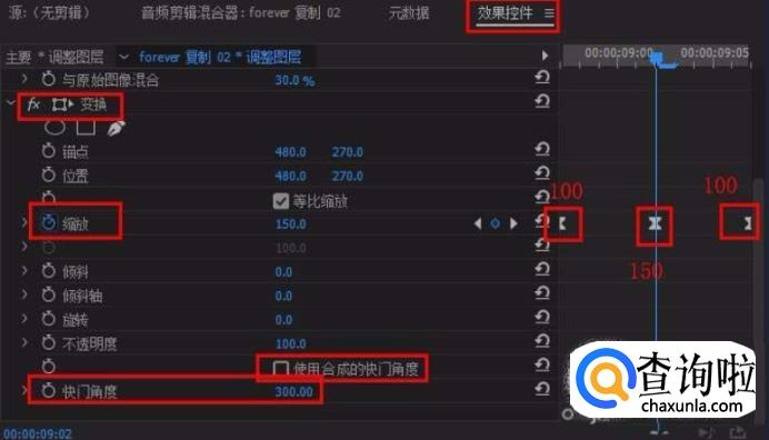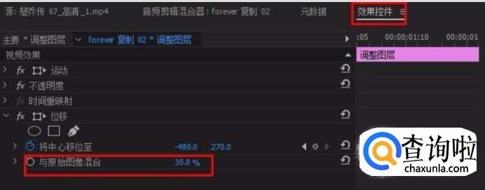 基本效果完成,修改“与原始图像混合”数值为30%(可自定)。这里需要注意哦:转场时间不宜过长,即两个关键帧距离不宜太远。