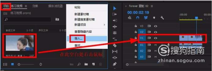 打开pr,然后在“项目”面板空白处右击鼠标,导入事先准备的两段视频,将视频拖到v1轨道上。