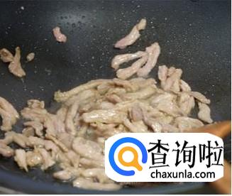 锅中加油,8分热加姜末爆炒,然后加猪肉,翻炒至其变色。