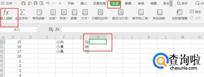 还有一种方法,我们点击数据旁边的单元格,然后点击公式下的插入函数。