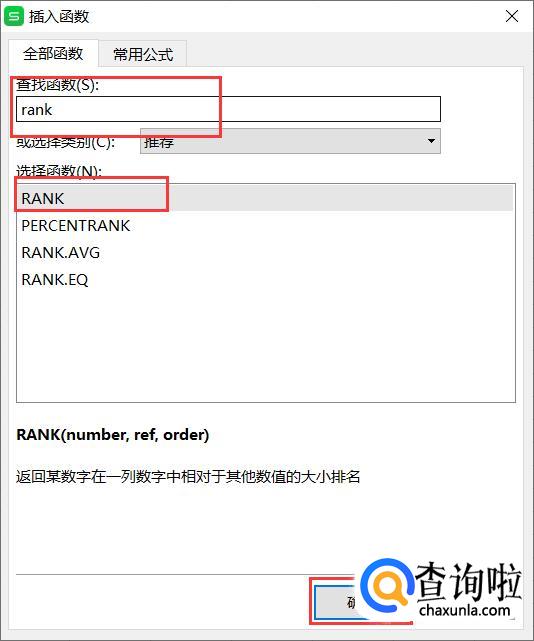 然后输入rank查找函数,选中第一个RANK,并点击确定按钮。