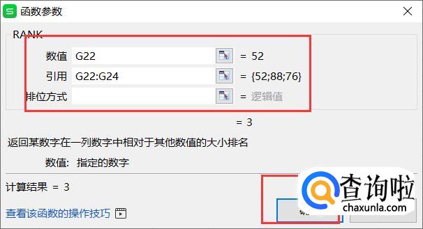 最后输入数值以及引用单元格,然后点击确定即可。这样也可以对数据进行排名。值得注意的是,在引用单元格的地方需要输入整个需要排名的单元格。