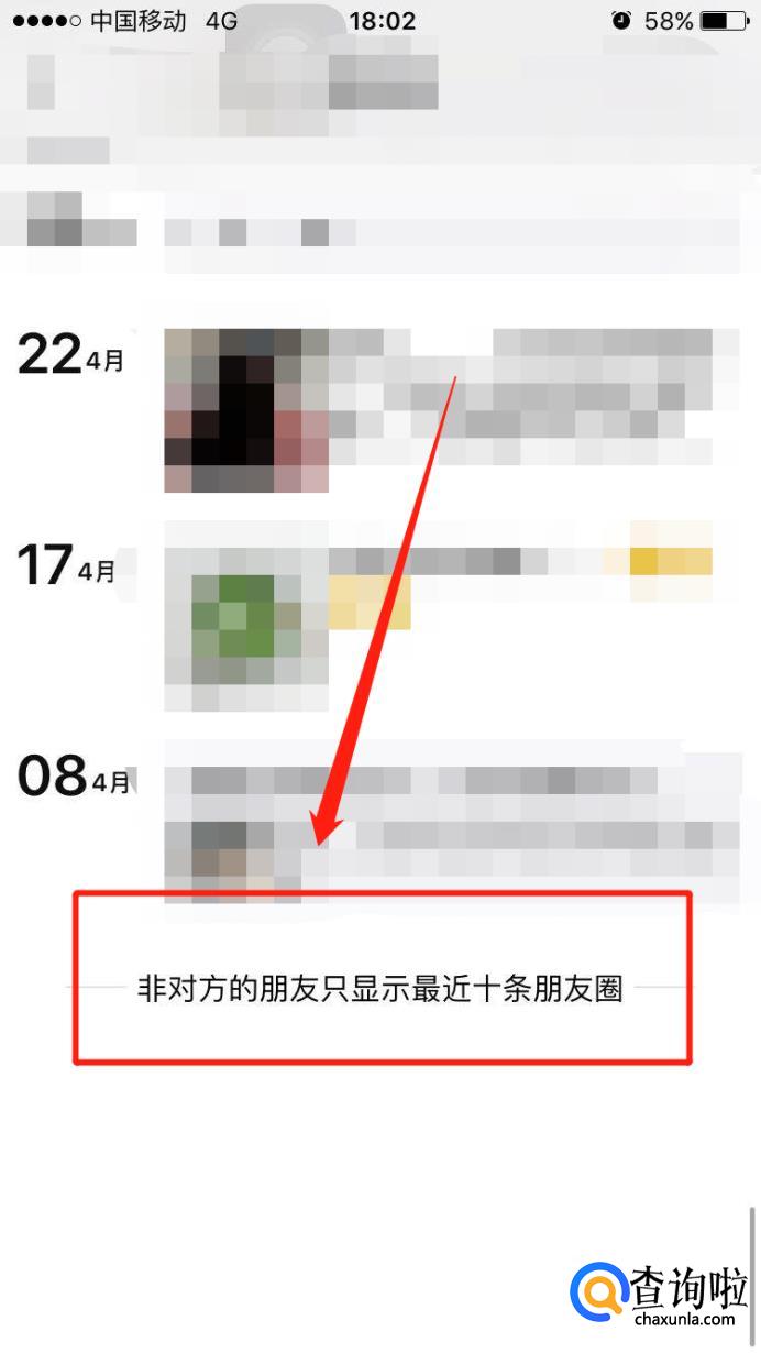 我们来验证他是否删除了你。如果他删除了你,然后自己的朋友圈设置的又是非朋友最多显示十张照片,会有如图提示。