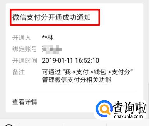 开通后,也可以收到微信支付的开通提醒,告知我们在哪里可以查看到自己微信的支付分。
