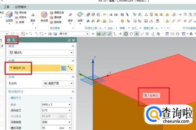 如下图所示,软件弹出了“孔”对话框,注意红色框选,其中一个红色框选框住的是“指定点”,一个红色框选框住的是“面/拉伸(1)”,这两个红色框选就是这一步需要操作的内容。
