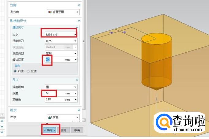 如下图所示,红色框选中笔者将螺纹改成了M36x4、螺纹深度改成了40、然后尺寸深度改为50,之后点击“确定”。这就完了螺纹孔特征的插入。