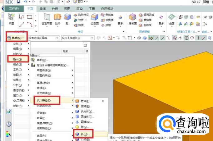 第二种方法:如下第二幅图所示,执行【菜单】【插入】【设计特征】【孔】。