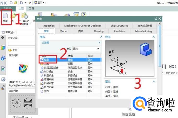 如下图所示,打开UG10.0软件,新建一个模型文件。具体操作步骤可见下图红色数字。