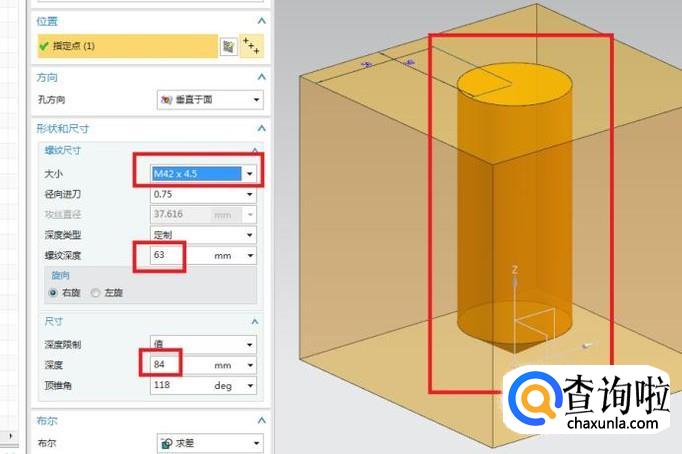 如下图所示,回到了三维建模工作状态,然后见红色框选,左边三个框住的是默认的螺纹孔的参数,例如螺纹的大小、螺纹的深度、和孔的深度。右边框住的是预览的螺纹孔效果。