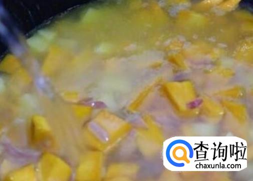 先在锅里面放上热油,接下来就能加上腊肠和洋葱在里面,等到香味出来之后就能生出来备用了,最后把土豆放入锅里面炒,等到土豆变了颜色以后再加上南瓜丁,等到看到南瓜已经变软以后就能加上开水了。