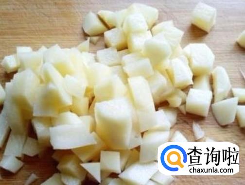 到了晚上就能去做土豆南瓜腊肠饭,需要准备的材料是腊肠和土豆,还有南瓜和洋葱,接下来就能把所有的材料全部都切成丁的形状。