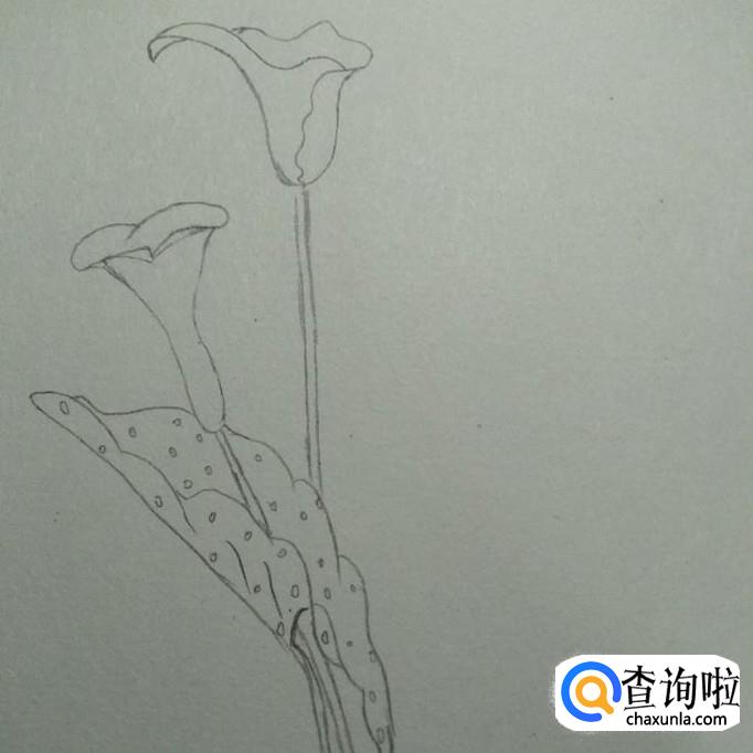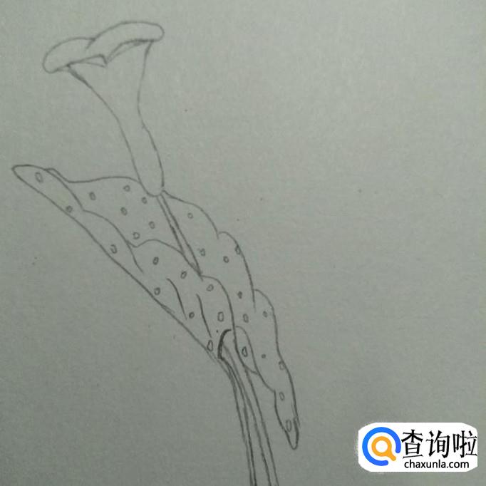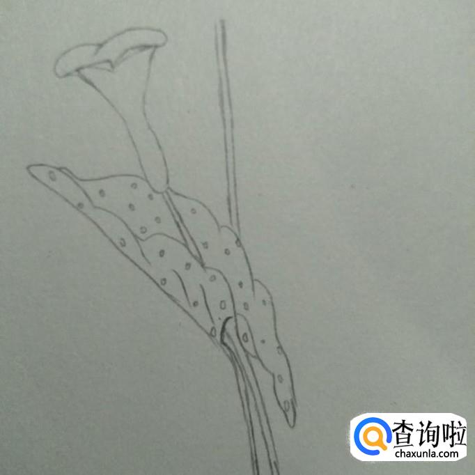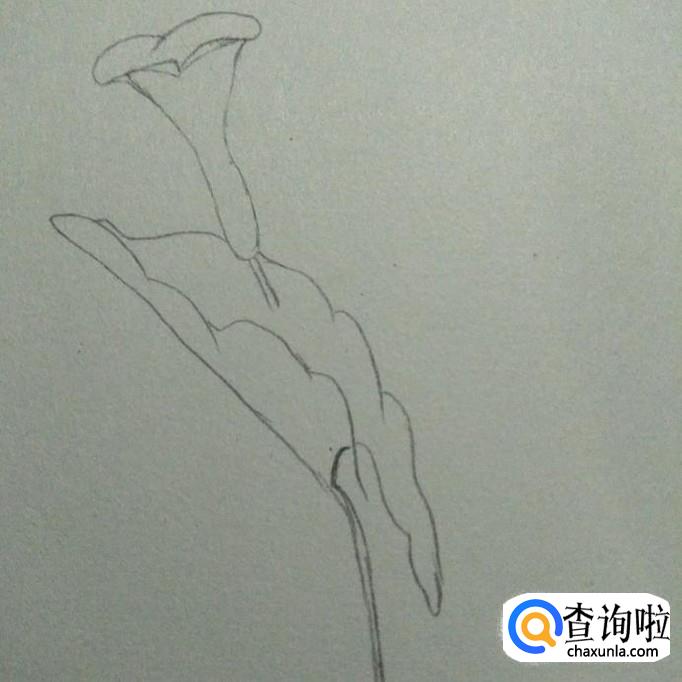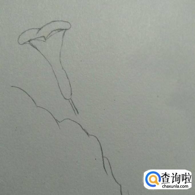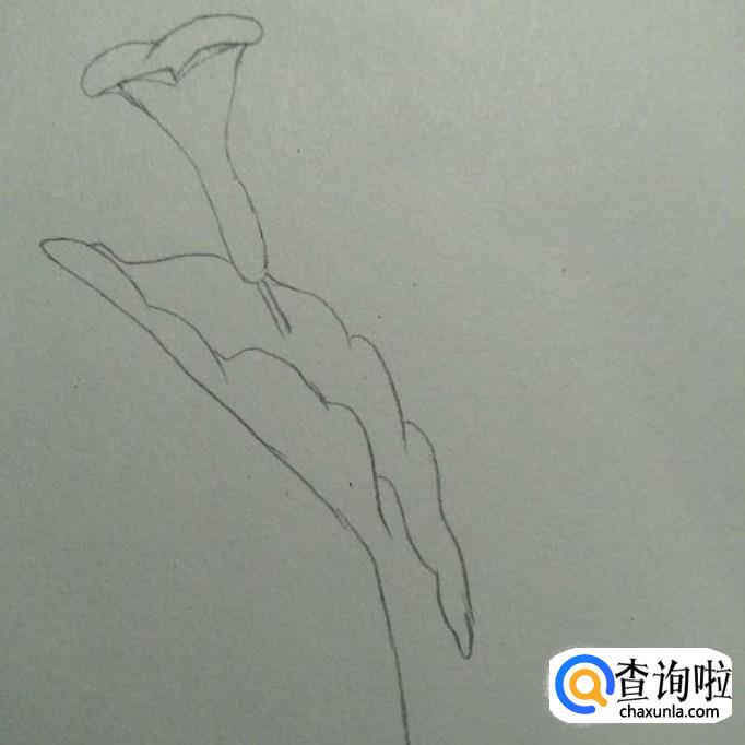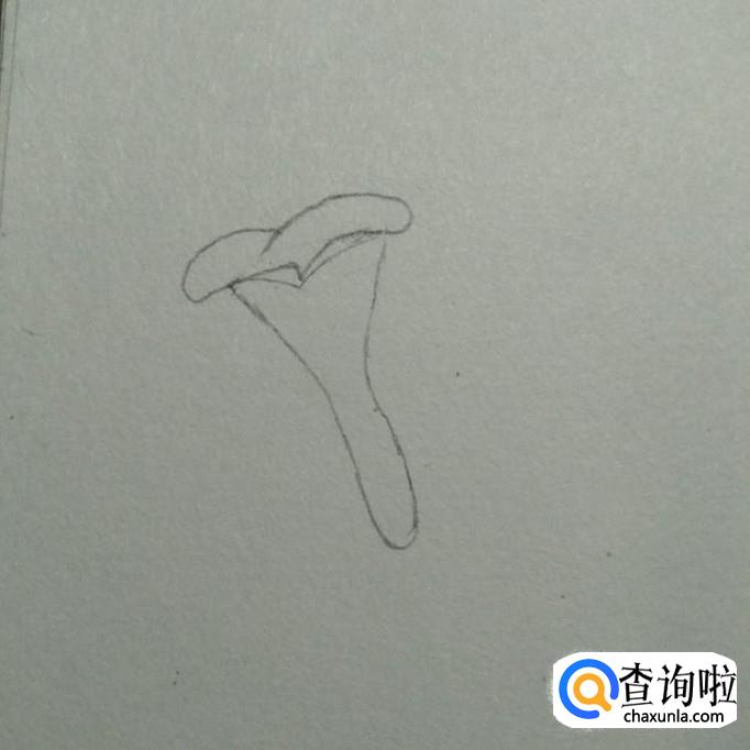 首先,我们在素描本上画出一个近似于喇叭形状的花形,其口向上,头部较宽,底部较窄,接下来,我们画一个尖端向下,两边向外凹的弧线,如下图2