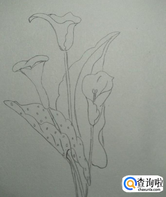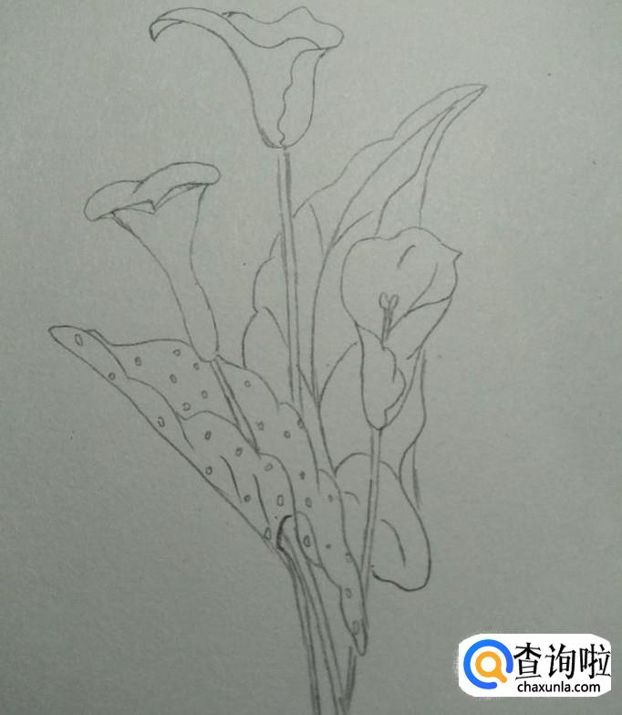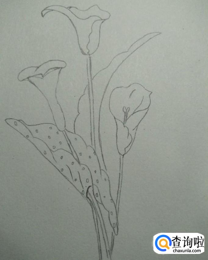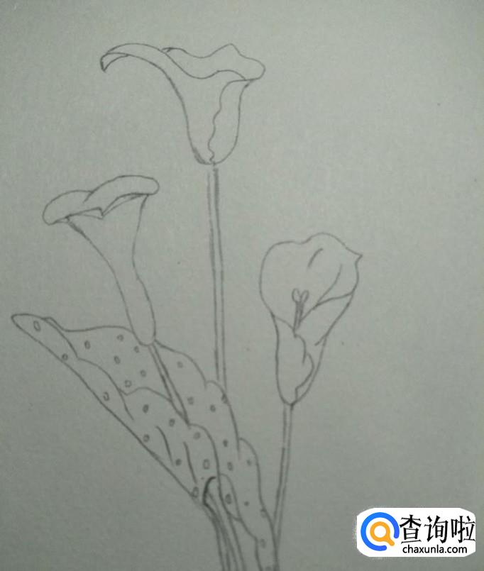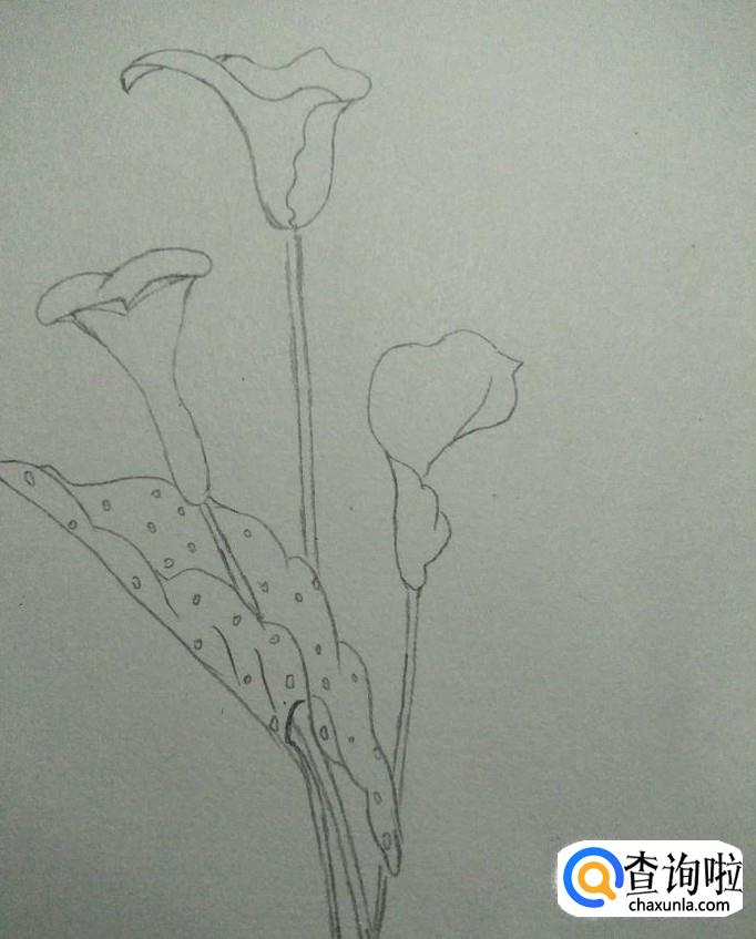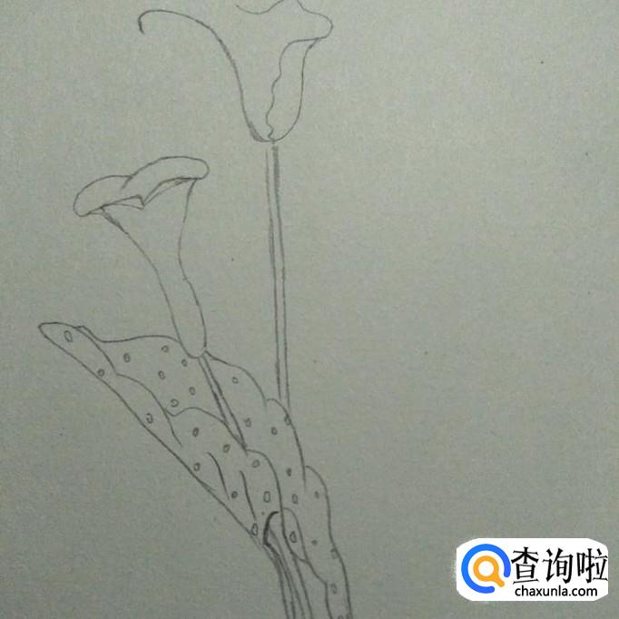 首先,我们在素描本上画出一个近似于喇叭形状的花形,其口向上,头部较宽,底部较窄,接下来,我们画一个尖端向下,两边向外凹的弧线,如下图2