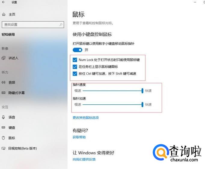 打开使用小键盘,控制鼠标的开关按钮之后,我们可以调整一下指针速度等。调整好之后,我们就可以使用小键盘的12346789八个数字来控制鼠标移动的八个方位了。
