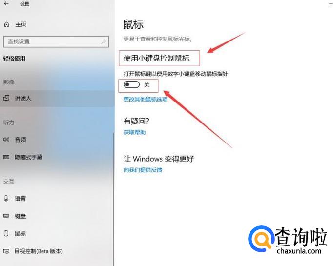 在这里我们可以看到使用小键盘控制鼠标的开关按钮了,我们直接点击下面的开关按钮打开就可以了。
