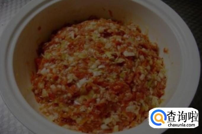 将胡萝卜与猪肉混合,加一个鸡蛋,葱姜蒜末适量,盐,老抽,豆瓣酱,花椒面,胡椒粉适量,再加入淀粉适量,顺着一个方向搅拌均匀。