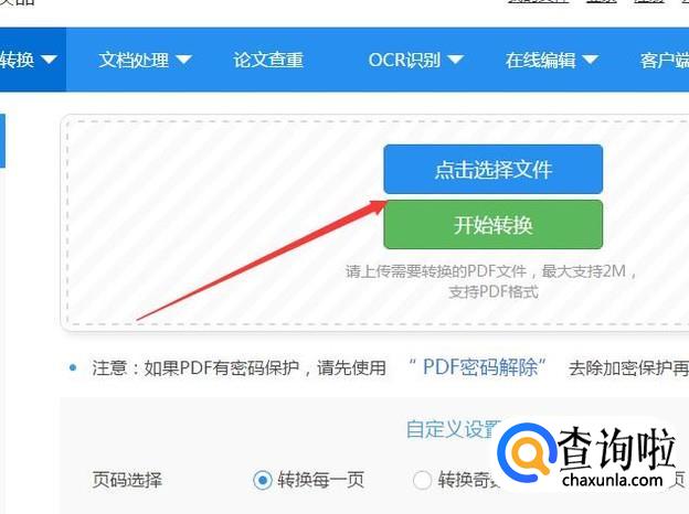 我们点开一个支持在线pdf格式文件转化为word格式文件的网址,看到首页上就有一个pdf转word的选项,我们点开这个选项,就看到了可以供我们上传文件的地方。